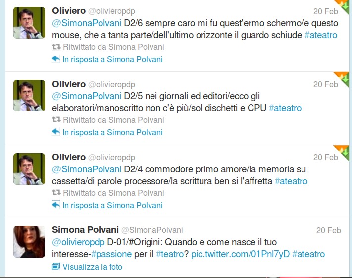 Chi non avesse potuto seguire allora la nostra intervista sulla piattaforma Twitter, potrà trovarla ora trascritta in versione completa nella pagina Twitter-Interviste/ Oliviero Ponte di Pino. Sempre in forma di Tweet!