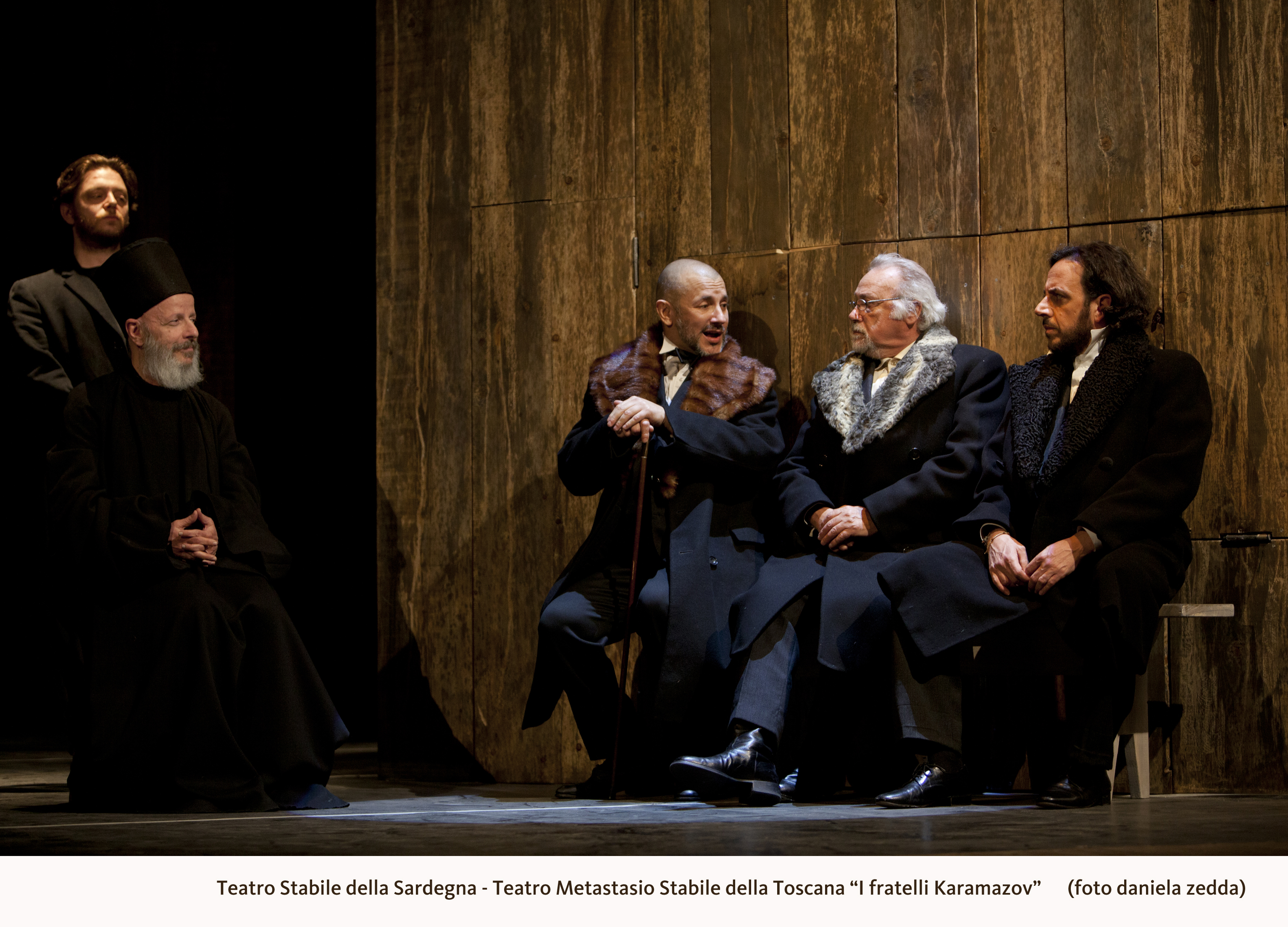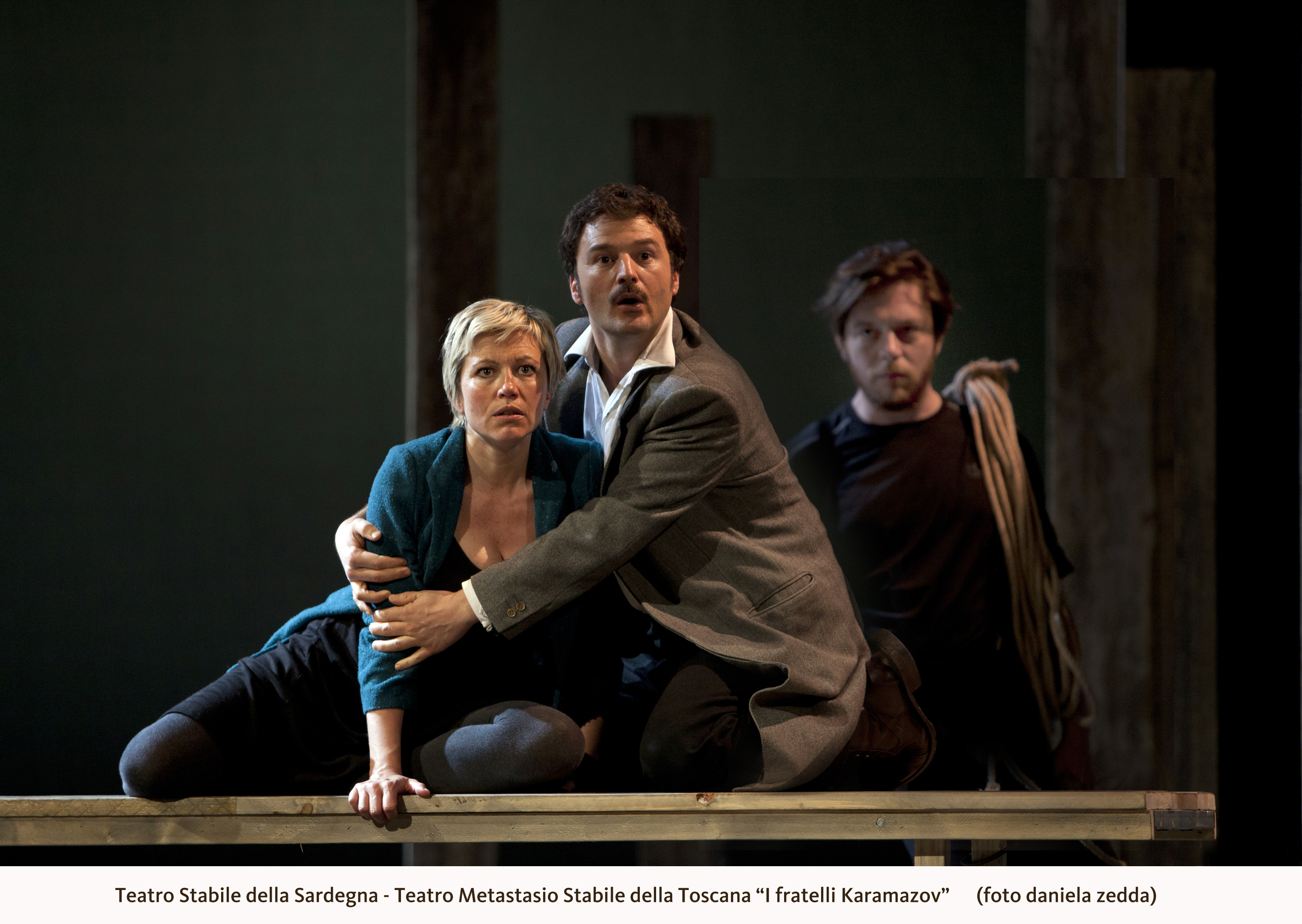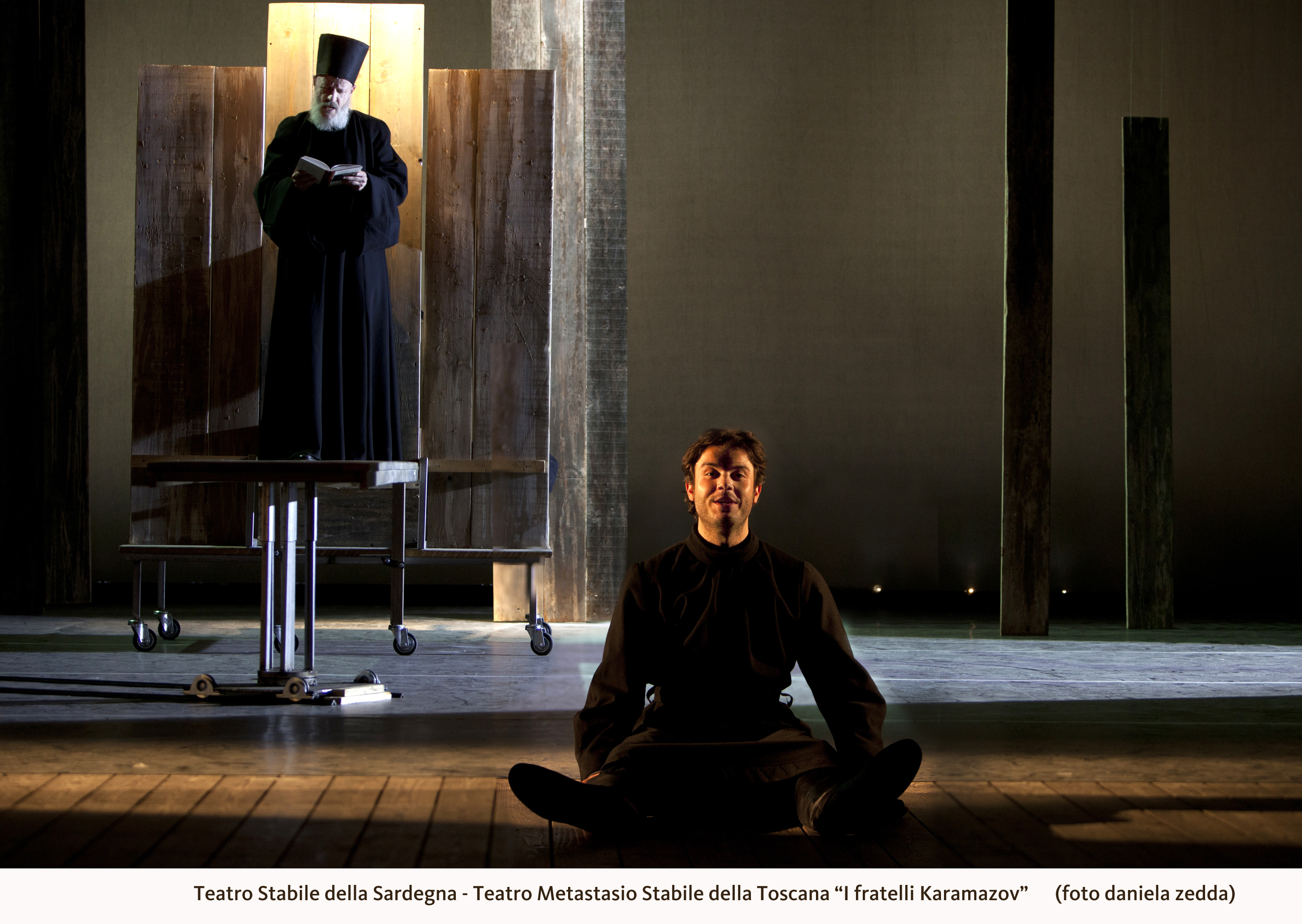 Dalla parete di sinistra si allunga sul palcoscenico un segmento, un tavolo, elemento che scomparirà e apparirà, si trasformerà più volte durante la messinscena anche in modo inaspettato (un altare-catafalco con luminarie ad esempio). Attorno ad esso sono seduti tre dei quattro Karamazov, il padre Fëdor Pavlovič (Mauro Malinverno), credente per interesse, i figli Ivan (Corrado Giannetti), che nega l’esistenza di Dio, e Alëša (Francesco Borchi), novizio presso il monastero retto dallo Stàrec Zosìma (Paolo Meloni). “Dio c’è o non c’è?”: questo l’argomento su cui dibattono sorseggiando alcolici, domanda che attraversa l’intero spettacolo, coinvolgendo molti dei personaggi, in un dialogo – che vorrebbe essere maieutico – per tesi da sposare o confutare. “Non c’è virtù se non c’è immortalità; se Dio non c’è, non c’è bisogno di virtù”: sarà così che il figlio illegittimo e servo Smerdjakòv (Luigi Tontarelli) giustificherà l’assassinio di Karamazov padre, senza necessità di assumersene la responsabilità, che ricadrà invece sul fratellastro Dmitrij (Fabio Mascagni). “Più riuscirete ad amare, più vi convincerete dell’esistenza di Dio e dell’immortalità”, sostiene lo Stàrec Zosima dialogando con la signora Chochlakov (Maria Grazia Sughi) in una delle scene più interessanti e compiute dello spettacolo. L’amore attivo, gratuito e fattivo, professato dallo Stàrec si contrappone all’amore del sognatore, difeso con un certo cipiglio dalla signora Chochlakov, ossia a quella forma di amore narcisistico che pretende di essere immediatamente pagato con la moneta sonante della riconoscenza: come avviene a teatro – dice padre Zosima- in cui si recita per ricevere gli applausi.