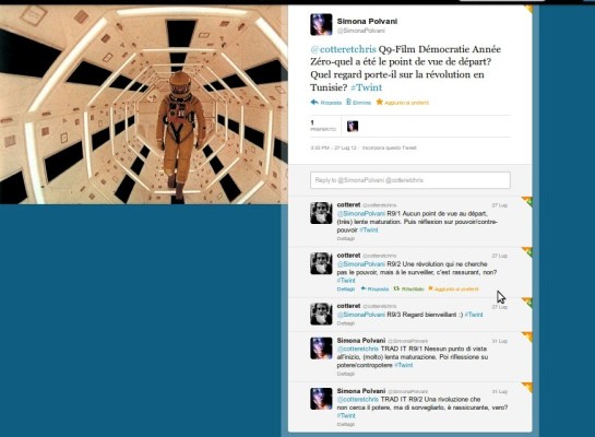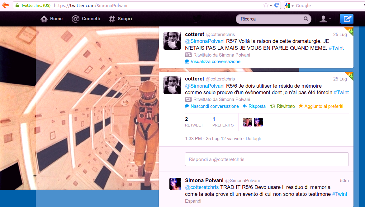 Per chi non avesse potuto seguirla su Twitter, oppure volesse rileggerla, ecco qui la nostra Tweet_intervista in versione integrale in italiano, trascritta così come si è svolta su Twitter, giorno per giorno e Tweet per Tweet.