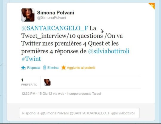 @SANTARCANGELO_F La Tweet_interview/10 questions /On va Twitter mes premières 4 Quest et les premières 4 réponses de @silviabottiroli #Twint