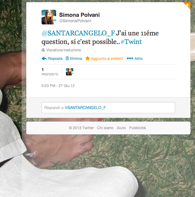 Per chi non avesse potuto seguirla su Twitter, oppure volesse rileggerla, ecco qui la nostra Tweet_intervista in versione integrale in italiano, trascritta così come si è svolta su Twitter, giorno per giorno e Tweet per Tweet.